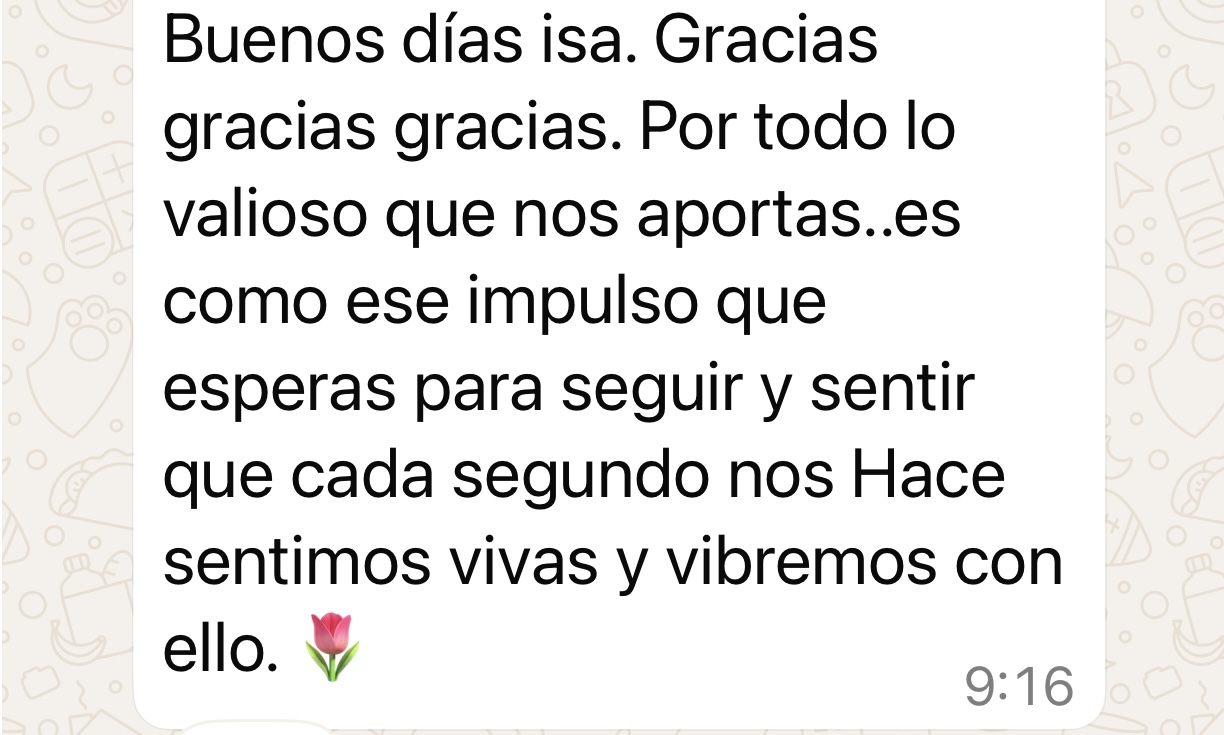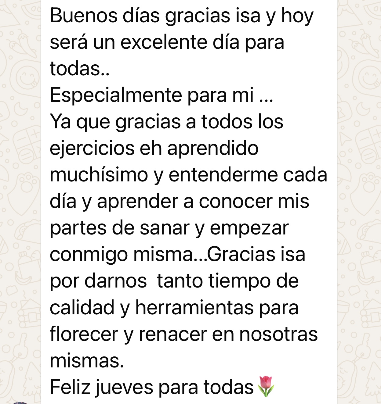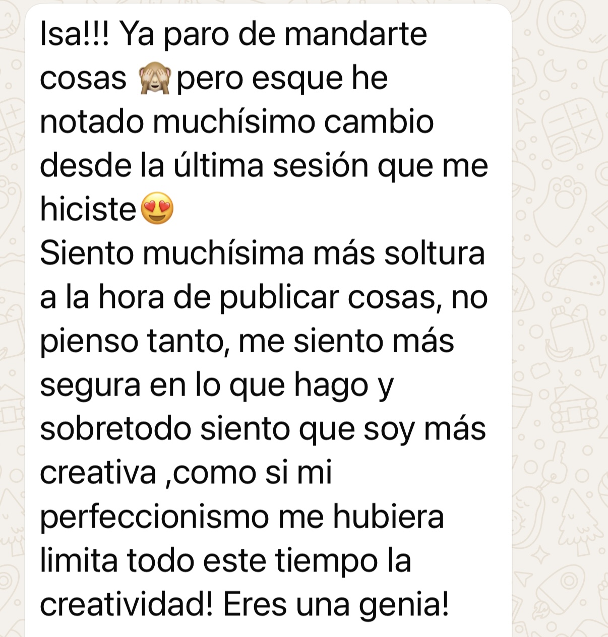 Quienes trabajan con ella describen su acompañamiento como cálido, cercano y revelador. Isa sabe exactamente cómo guiarte para que sueltes cargas que no te pertenecen, cambies patrones que te frenan y recuperes esa versión auténtica y segura que quizás habías olvidado.